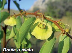 DRAČA Drača (Paliurus spina-christi) je 2-3 m visok, razgranjen, trnovit, listopadni grm ili manje drvo koje kod nas raste u području uz jadransku obalu. Latinski naziv biljke vezan je uz legendu po kojoj je Krist bio okrunjen krunom pletenom od drače. Biljka obično raste u u većim skupinama i zajedno s ostalim grmljem stvara velike i guste, neprohodne šikare. Ima jak i razvijen korijen koji prodire duboko u zemlju. Sivosmeđe do tamnosmeđe sjajne grane prekrivene su čvrstim i oštrim trnovima koji su smješteni u parovima, ali tako da je jedan uvijek malo kraći i savinut unazad. Listovi su jajoliki, kožasti, sjajnozeleni, 2-5 cm dugi i 1-4 cm široki, čitavog ili blago nazubljenog ruba, spiralno smješteni na granama. Sitni, zvjezdasti, peterolatični, žuti ili zelenkastožuti cvjetovi, razvijaju se u pazušcima listova od svibnja do kraja ljeta, čineći guste grozdaste cvatove. Nakon cvatnja razvijaju se plodovi, okrugle i plosnate koštunice sa širokim, valovitim krilcem, koje imaju promjer oko 1,5-3 cm. Izgledom nalikuju na disk (nekima na tanjurić, šeširić ili kolačić) koji je u sredini odebljao, a prema rubovima je stanjen, valovito narovašen, radijalno isprugan i povijen prema strani suprotnoj od drška. Plodovi su u početku žučkastozelene, a kad dozriju postaju žutonarančaste boje, dok koštica koja sadrži 3 sjemenke postane tvrda i drvenasta, a krilce suho, krhko i lomljivo. Drača se često sadi kao ukrasni grm, živa ograda i medonosna biljka.